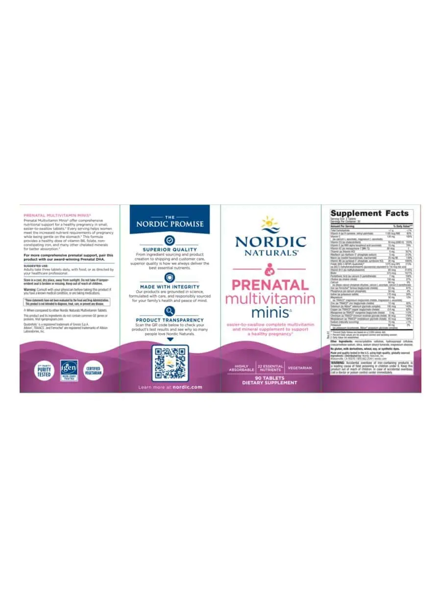 Prenatal Multivitamin Minis — offer comprehensive nutritional support for a healthy pregnancy in small, easier to-swallow tablets.* Every serving helps women meet the increased nutrient requirements of pregnancy while being gentle on the stomach.* This formula provides a healthy dose of vitamin B6, folate, non-constipating iron, and many other chelated minerals for better absorption.