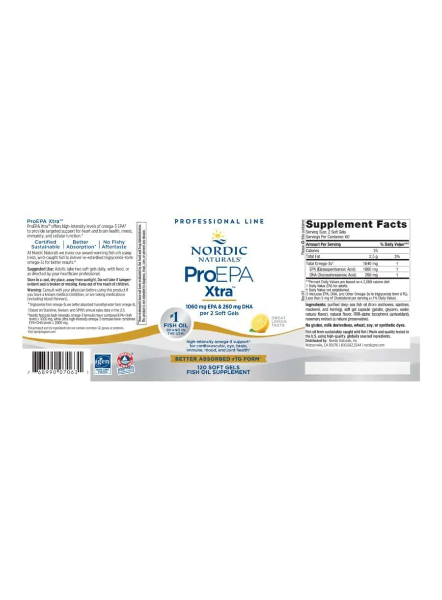 Nordic Naturals EPA Xtra is an ultra high concentration of EPA, an Omega-3 essential fatty acid recommended by doctors for cardiovascular health and proper immune support.* EPA Xtra is molecularly distilled for purity and concentration, and has added rosemary extract for superior freshness. This formula provides excellent nutritional support for the body to manufacture vital series 3 prostaglandins, and is “repeat” and “odor free.”
