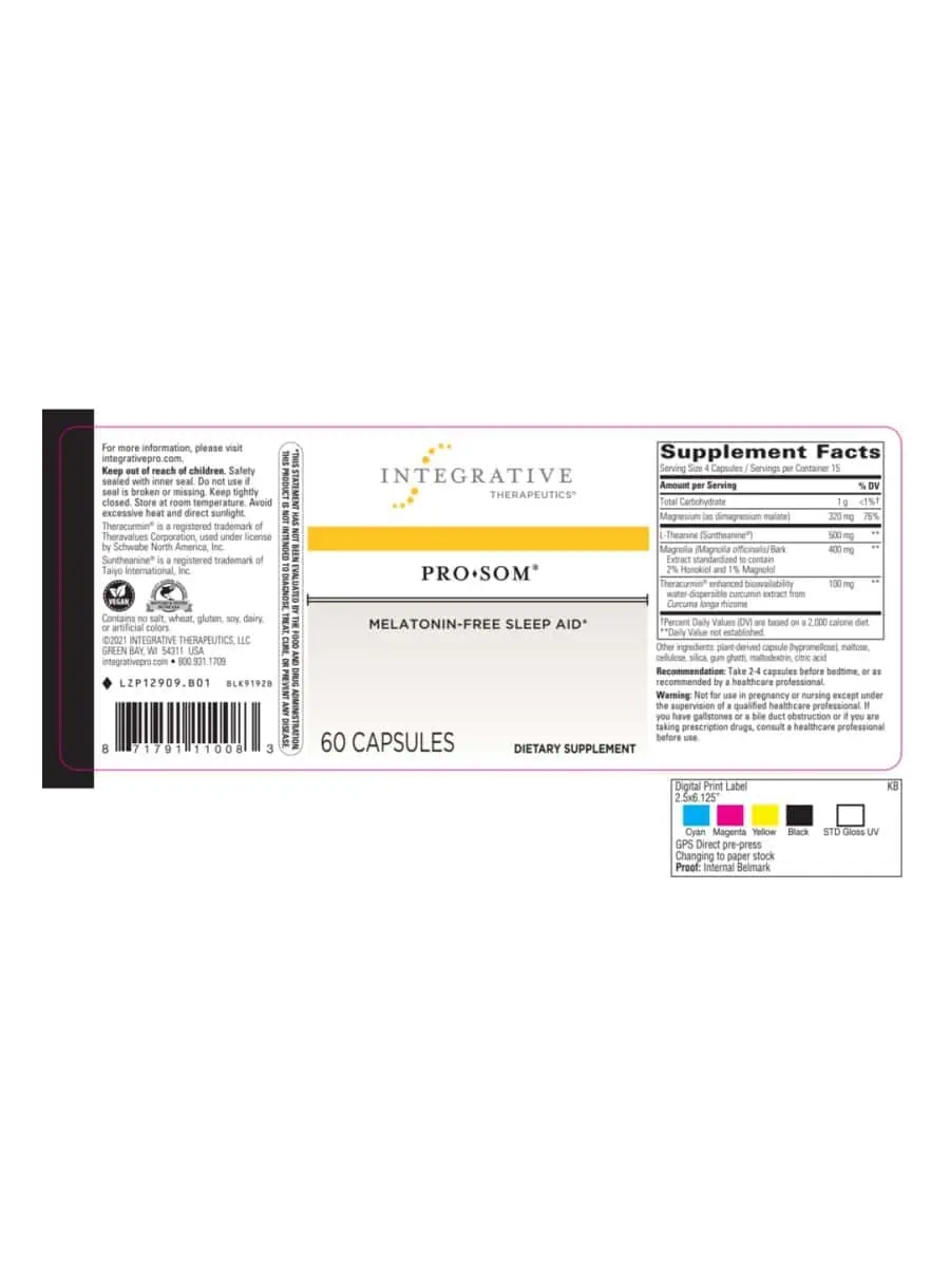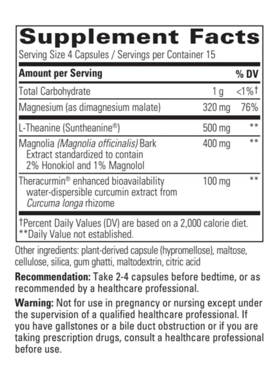 Pro Som combines the relaxing benefits of L-theanine with magnesium, magnolia bark, and Theracurmin®, designed to improve sleep quality and reduce waking after sleep onset. This formula supports restful sleep and relaxation without melatonin, reducing the known concerns regarding melatonin intolerance in certain people and melatonin-related morning grogginess.