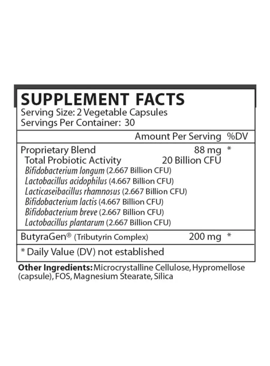 The proprietary blend includes various strains of probiotics, such as Bifidobacterium and Lactobacillus, which work synergistically to maintain gut health. The addition of ButyraGen (Tributyrin Complex) further supports digestive function.