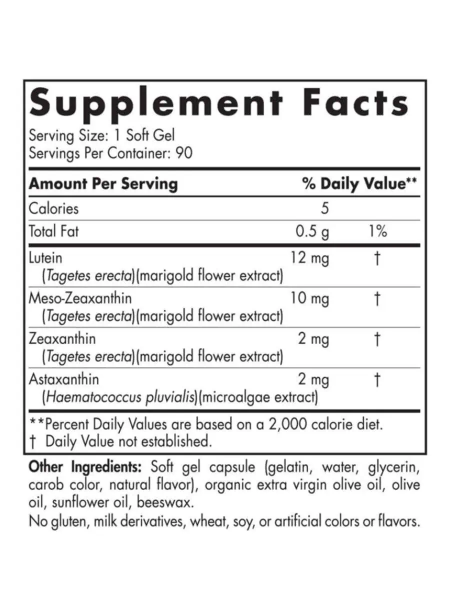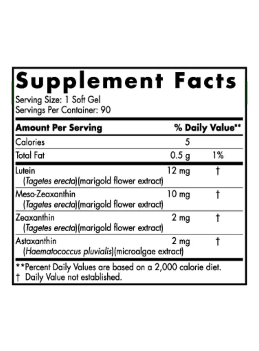 This formula features lutein, meso-zeaxanthin, and zeaxanthin sourced from marigold flower extract, along with astaxanthin from microalgae, all known for their roles in promoting eye health.