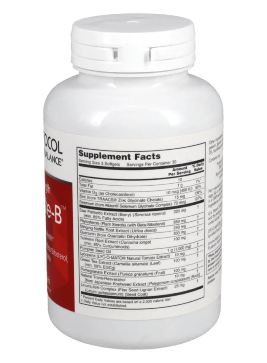 Prostate-B — This clinical strength formula is specifically designed to support prostate health with a blend of potent botanical ingredients including Saw Palmetto Extract, Lycopene, and Beta-Sitosterol. Enhanced with essential nutrients like Zinc, Selenium, Quercetin, and Vitamin D3, it promotes optimal urinary tract function and provides targeted nutritional and antioxidant support for the prostate, helping to maintain healthy prostate tissues.