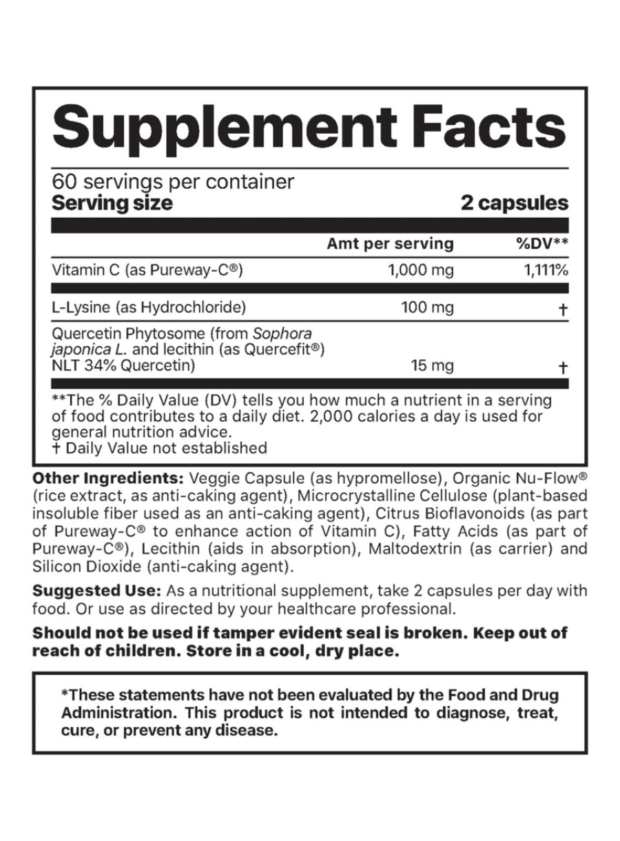 Pureway-C® is clinically proven to be more rapidly absorbed and retained in human cells compared to other forms of Vitamin C, providing faster and more beneficial effects. L-Lysine, an essential amino acid, supports calcium absorption and collagen formation, further enhancing overall health.