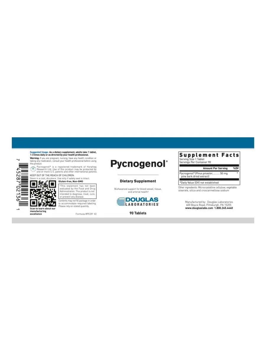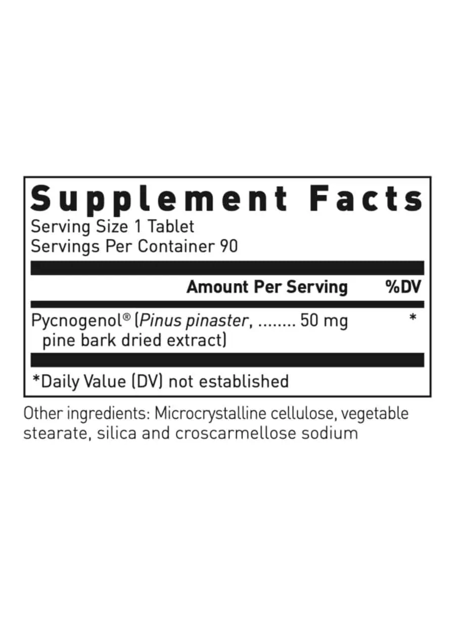 Pycnogenol® tablets contain pure, patented pine bark extract in 50 mg scored tablets. Pine bark extract is a bioflavonoid that supports blood vessel, tissue and arterial health.
