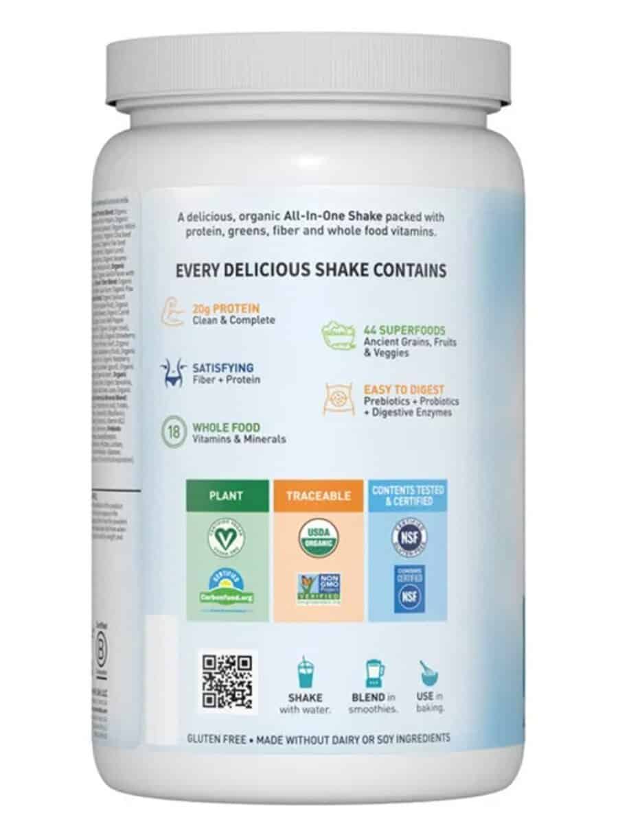 This shake features an organic sprouted protein blend, providing essential amino acids and nutrients. It also includes a variety of fruits and vegetables, ensuring a rich source of vitamins and minerals.
