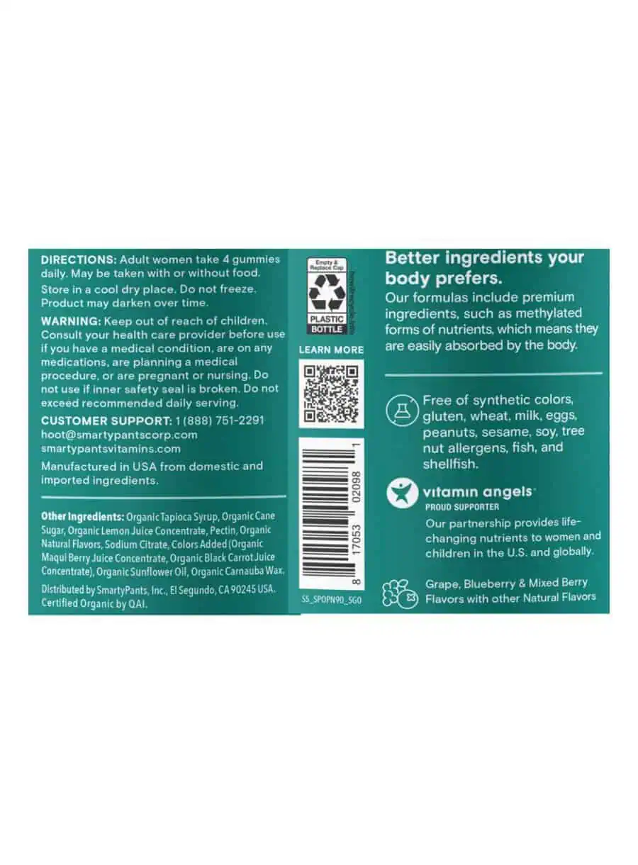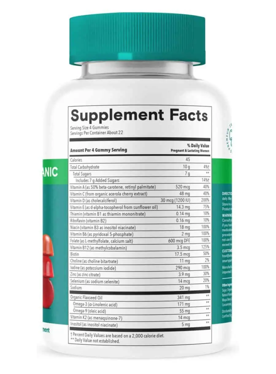 SmartyPants Organic Prenatal plus Multi & Omegas is a specially formulated gummy vitamin designed for expectant mothers. These delicious gummies provide essential nutrients such as folate, vitamins C and D, and omega-3 fatty acids, all sourced from organic ingredients. With a focus on organic nutrition, this product supports both maternal health and fetal development, making it an ideal choice for women during pregnancy.