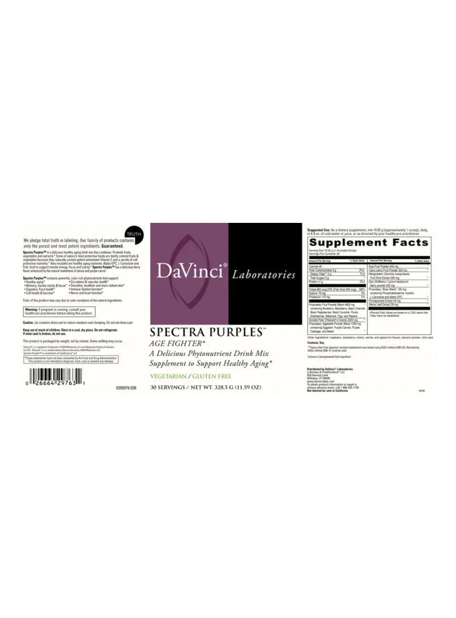 Spectra Purples — A delicious, anti-aging drink mix that combines 19 nutrient-rich whole fruits, vegetables, and extracts. Some of nature’s most protective foods are darkly colored fruits and vegetables because they are rich in antioxidants such as phenols, anthocyanins, ellagic acid, proanthocyanidins, bioflavonoids, and Vitamin C, which provide a variety of health benefits. Also included are anti-aging nutrients: Alpha GPC, L-Carnosine, and Folic Acid to support mental energy, focus, and clarity.