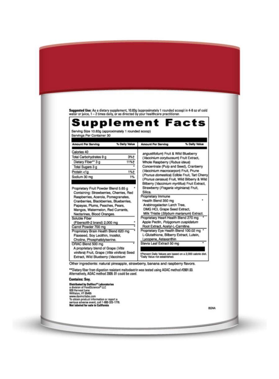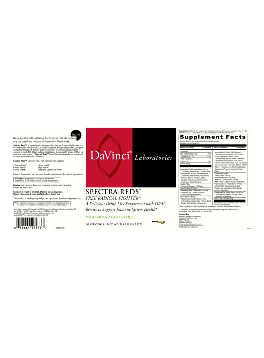 Spectra Reds™ — A powerful blend of nutrients specifically designed to support your body’s defense system. This delicious fruity powder contains nutrient-rich berries, fruits, and potent plant extracts, including DMG HCl, acetyl L-carnitine, phosphatidylserine, resveratrol, lycopene, and lutein. It helps to support optimal liver, immune, neurological, cardiovascular, and eye functions. Each serving contains a minimum of 5000 ORAC units and 3 grams of fiber for digestive tract support, making it a convenient way to boost your energy and support overall health.