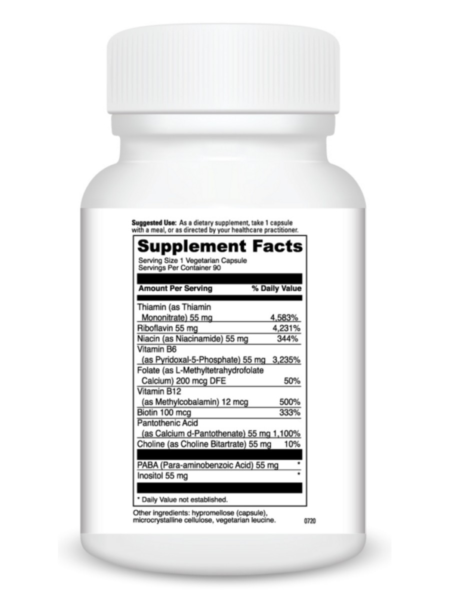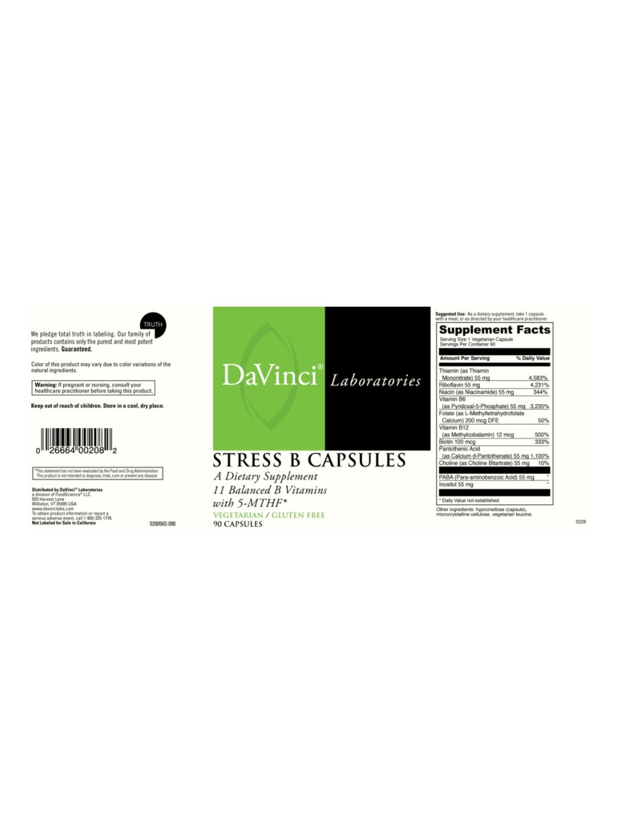 Stress B — This dietary supplement is designed to support proper nerve function and relaxation through a comprehensive blend of B vitamins. It helps manage stress, supports immune system function, and reduces irritability. The Vitamin B complex in Stress B is essential for maintaining healthy circulatory function, blood pressure, cholesterol levels, and homocysteine levels already in the normal range. Available in a vegetarian, gluten-free, and easy-to-swallow capsule.