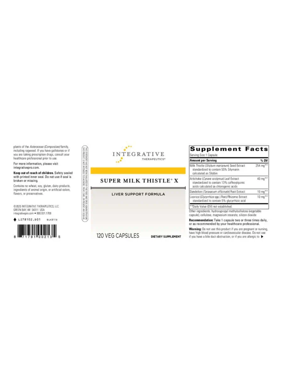 Super Milk Thistle X — This advanced formula combines bioavailable milk thistle extract with artichoke, dandelion, and licorice root extracts to support healthy liver function and bile production. Standardized to contain 55% silymarin, this vegetarian-friendly supplement enhances absorption through phytosome technology, making it an excellent choice for those seeking liver health support.