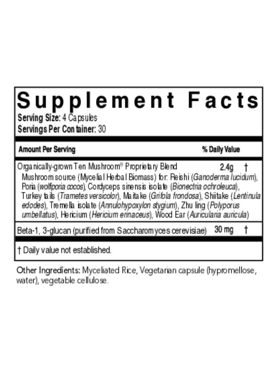 Ten Mushroom Formula — This multi-targeted mushroom formula features 10 organically grown mushroom varieties, enhanced with additional beta glucans, to provide comprehensive daily support for optimal immunity and total-body health. Perfect for families, this blend is designed to help balance and optimize immune responses, promoting long-term wellness and vitality.