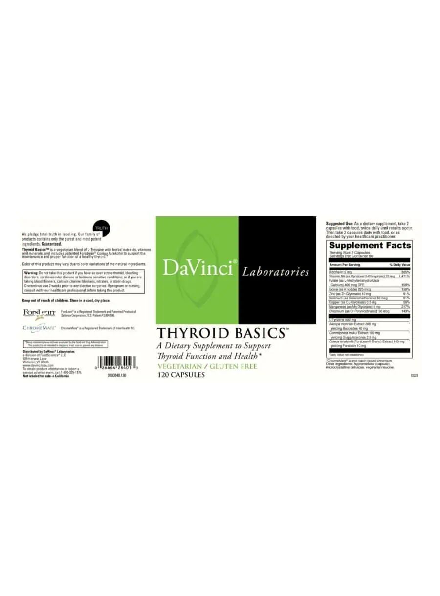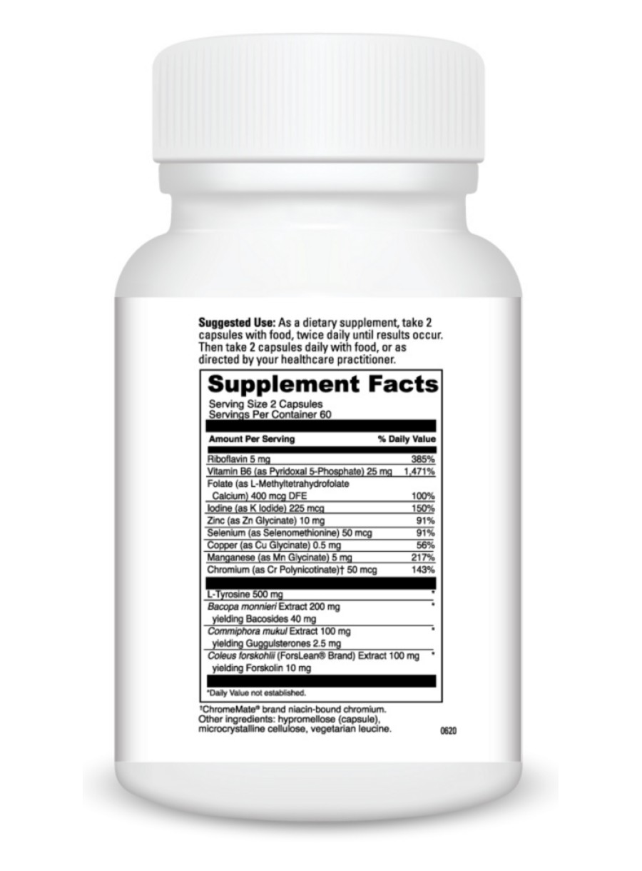 Thyroid Basics — is a dietary supplement designed to support thyroid function and health. This vegetarian blend includes Tyrosine, selenium, iodine, copper, zinc, manganese, ForsLean brand Coleus Forskohlii, Bacopa monnieri, guggulsterones, Chromium, and B vitamins, all working synergistically to optimize thyroid function, relieve fatigue, manage weight, appetite, and mood, improve T4 and T3 ratios, and elevate cellular metabolism.