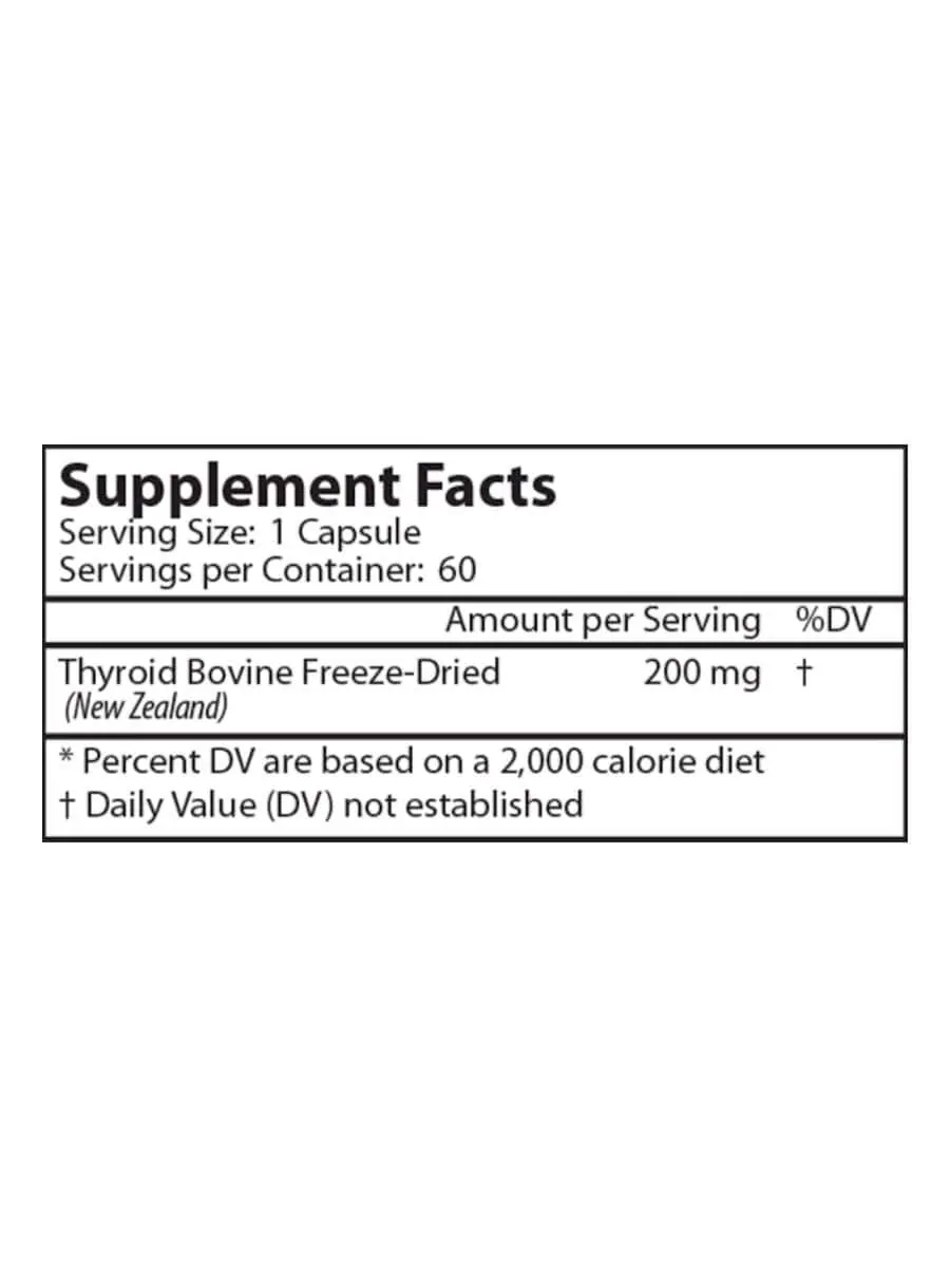 Thyroid Gland — This dietary supplement is designed to support thyroid health and function, particularly for individuals with suboptimal gland functioning. Each capsule contains freeze-dried bovine thyroid glands sourced from grass-fed, free-range New Zealand cattle, ensuring high quality and efficacy. Ideal for adults and children aged twelve and older, this supplement is free from common allergens such as wheat, gluten, corn, dairy, soy, and yeast.
