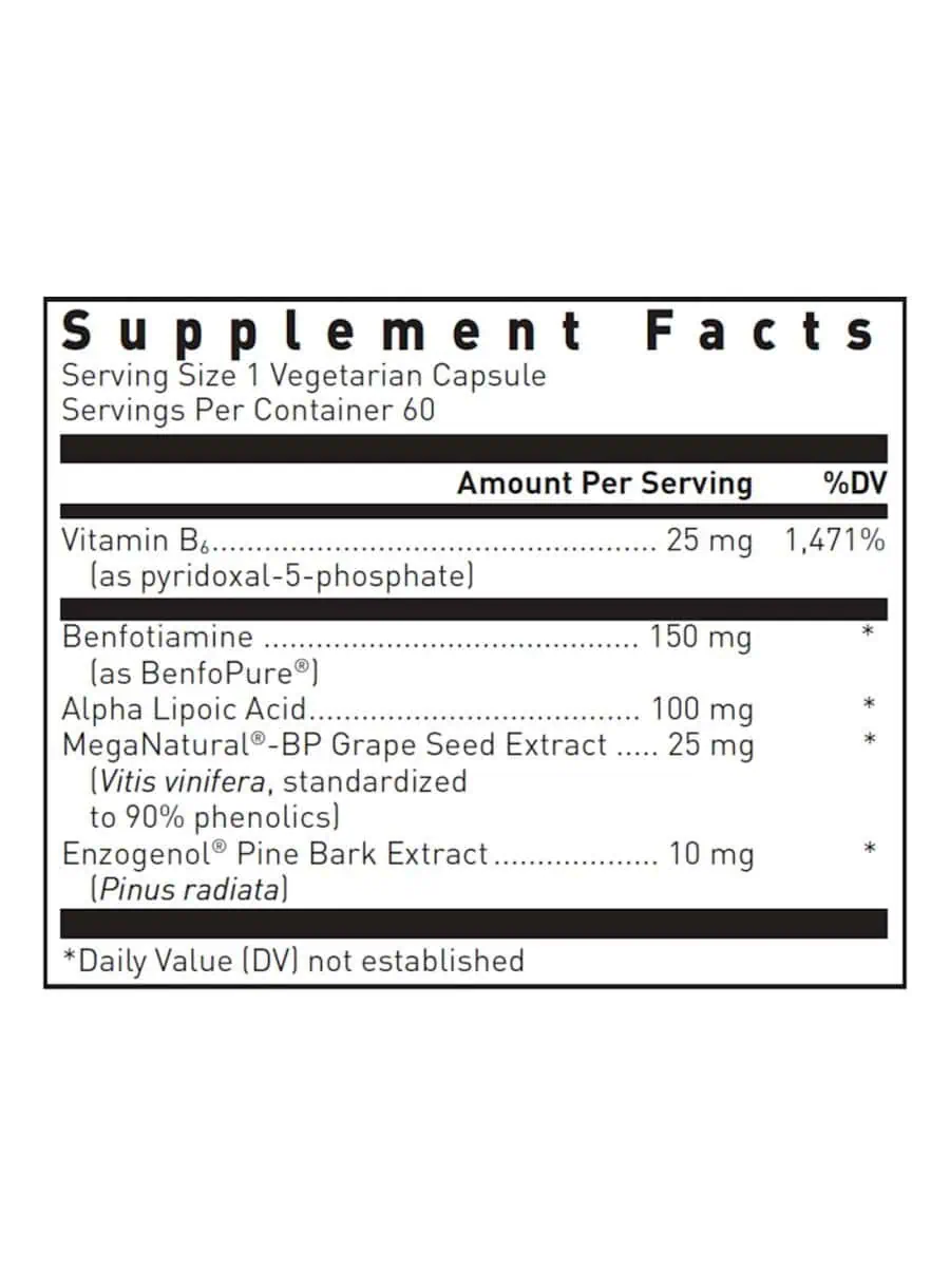 Vitamin B6 has been shown to help provide comfort for peripheral nerves, especially in those individuals with pyridoxine deficiency. Pyridoxal – 5 – Phosphate (P5P) is the active form of pyridoxine that the body utilizes directly without need for conversion from pyrido xine. A lpha lipoic acid (ALA) is among the well – researched nutrients for support of peripheral n erve function. ALA may normalize nitric oxide levels to support increased circulation to the neurons. One study confirmed ALA result e d in significant reductions in lipid peroxidation . Proanthocyanidins are a class of potent antioxidants found in pine bark extract, grape seed extract, and many other plants. OPC (oligomeric proanthocyanidins) has been shown to neutralize free radicals, support the strength and structure of blood vessels, and support the normal inflammatory response. † MegaNatural ® BP Grape seed extract is different from other grape seed extracts and made by a patented water extraction process that yields a high grade extr act with a low molecular weight. Mega Natural BP extract contains over 90% proanthocyanidins. Studies in humans also show it can help maintain normal arterial function and endothelium cell function.