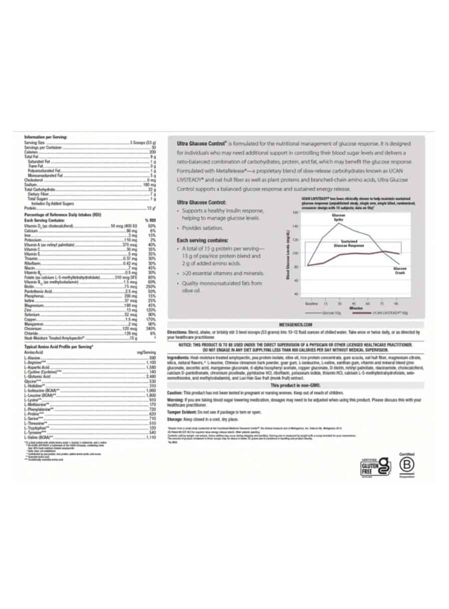 Ultra Glucose Control® is formulated for the nutritional management of glucose response. It is designed for individuals who may need additional support in controlling their blood sugar levels and delivers a ratio-balanced combination of carbohydrates, protein, and fat, which may benefit the glucose response. Formulated with MetaRelease®—a proprietary blend of slow-release carbohydrates known as UCAN LIVSTEADY® and oat hull fiber as well as plant proteins and branched-chain amino acids, Ultra Glucose Control supports a balanced glucose response and sustained energy release.