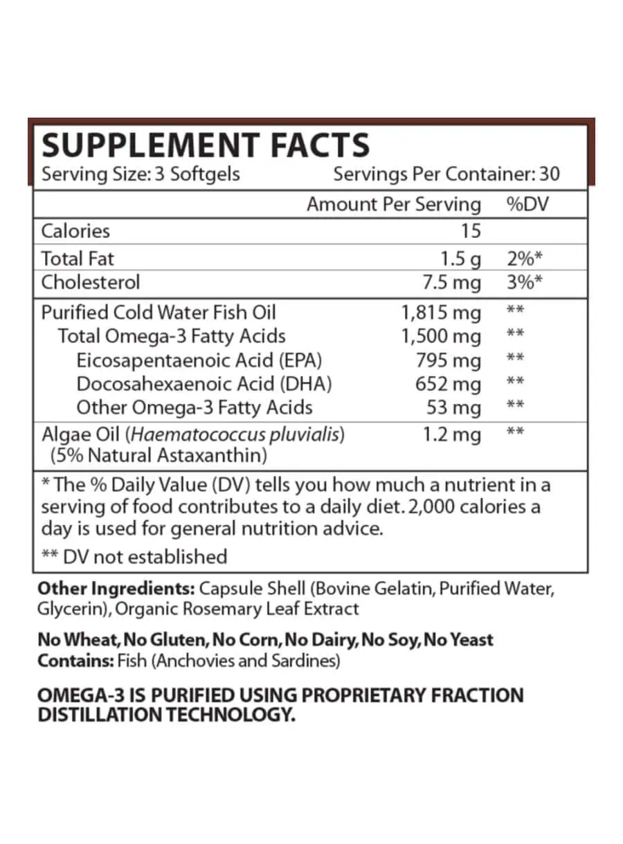 Ultra Omega-3 features Astaxanthin from Algae Oil, which provides antioxidant support and stabilizes the fish oil, enhancing its effectiveness.