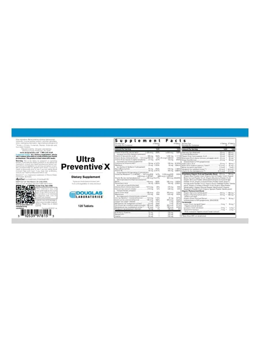 Ultra Preventive X — Douglas Laboratories’ most comprehensive multivitamin and mineral supplement, featuring an organic fruit, vegetable, and phytonutrient blend. This unique formula provides antioxidant support and beneficial nutrients, including carotenoids, flavonoids, polyphenols, and bioavailable forms of vitamins and minerals that contribute to optimal health.