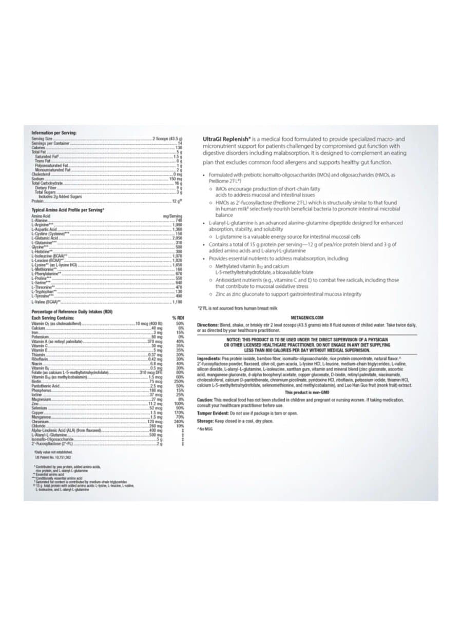 UltraGI Replenish® is a medical food formulated to provide specialized macro-and micronutrient support for patients challenged by compromised gut function with digestive disorders including malabsorption. It is designed to complement an eating plan that excludes common food allergens and supports healthy gut function.