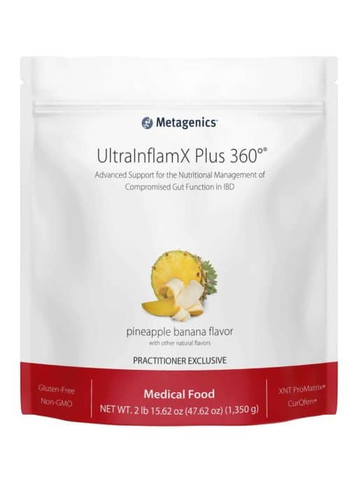 UltraInflamX Plus 360°® is a medical food formulated to provide strategic macro- and micronutrient support for patients with compromised gut function resulting from inflammatory bowel disease, including ulcerative colitis and Crohn’s disease. Provided in a proprietary, vegan pea/rice protein base, this formula addresses increased nutrient needs and potential deficiencies in these patients. This formula features CurQfen®, a clinically studied, patented curcumin blend designed for greater bioavailability and more reliable clinical outcomes. It has been demonstrated to result in up to 45.5 times more free curcuminoids in human plasma compared to standard curcumin extract. UltraInflamX Plus 360° also features XNT ProMatrix®– a proprietary protein matrix technology designed to enhance the delivery of a high quality xanthohumol compound for increased bioavailability and stability.