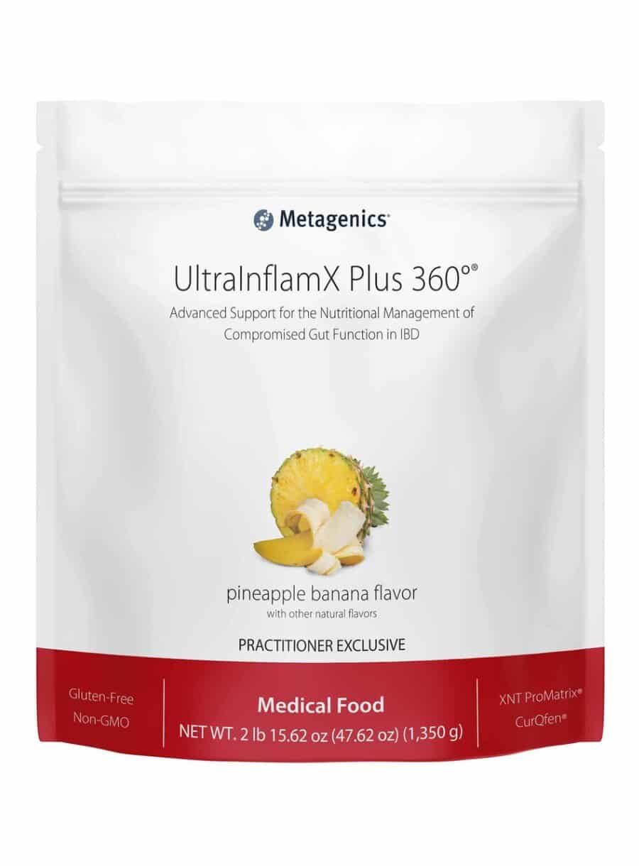 UltraInflamX Plus 360°® is a medical food formulated to provide strategic macro- and micronutrient support for patients with compromised gut function resulting from inflammatory bowel disease, including ulcerative colitis and Crohn’s disease. Provided in a proprietary, vegan pea/rice protein base, this formula addresses increased nutrient needs and potential deficiencies in these patients. This formula features CurQfen®, a clinically studied, patented curcumin blend designed for greater bioavailability and more reliable clinical outcomes. It has been demonstrated to result in up to 45.5 times more free curcuminoids in human plasma compared to standard curcumin extract. UltraInflamX Plus 360° also features XNT ProMatrix®– a proprietary protein matrix technology designed to enhance the delivery of a high quality xanthohumol compound for increased bioavailability and stability.
