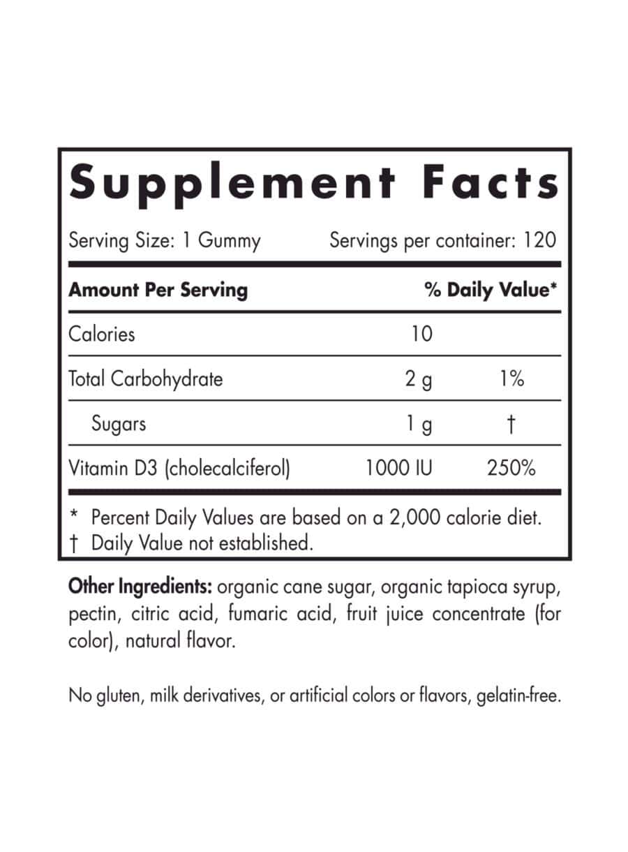Nordic Naturals Vitamin D3 Gummies provide 1000 I.U. of vitamin D in each serving. These great-tasting vitamins are made from cholecalciferol, the natural form of vitamin D, preferred for optimal absorption.*