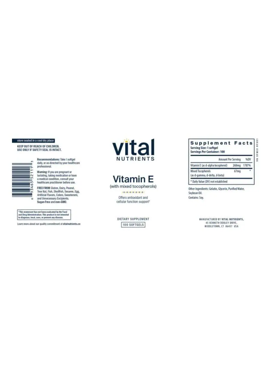 Vitamin E — This powerful antioxidant supports cardiovascular health and promotes healthy blood vessels. With 400 IU of natural Vitamin E, including mixed tocopherols, it provides a comprehensive approach to antioxidant protection against free radicals. Ideal for those looking to enhance their overall health, Vitamin E plays a crucial role in maintaining cell membrane integrity and supporting cognitive function.