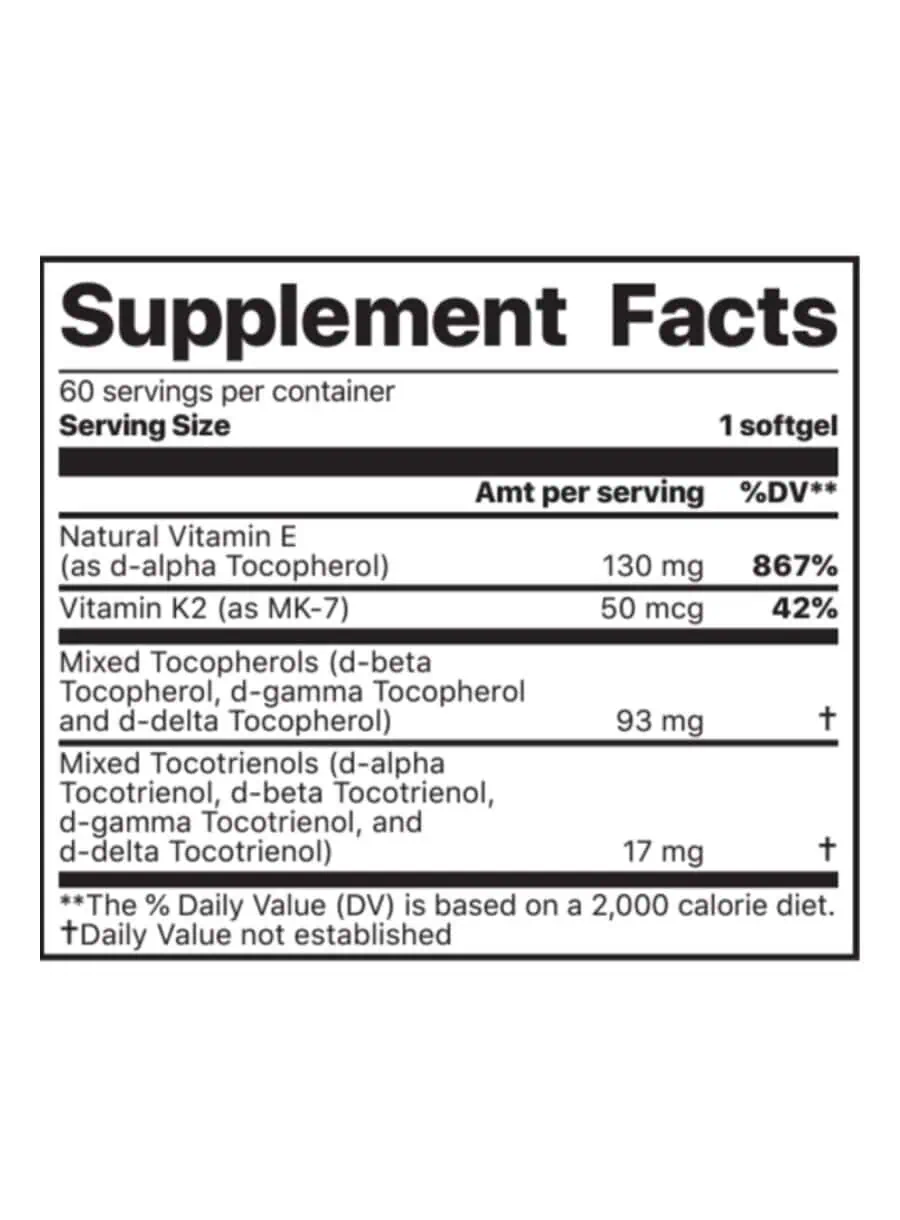 Vitamin K2 + E Complex — This powerful supplement features MenaQ7® Vitamin K2, the most effective form of Vitamin K2, combined with a full-spectrum Vitamin E Complex. This unique blend is essential for building healthy bone tissue, maximizing calcium absorption and utilization, and helps protect the aging brain.