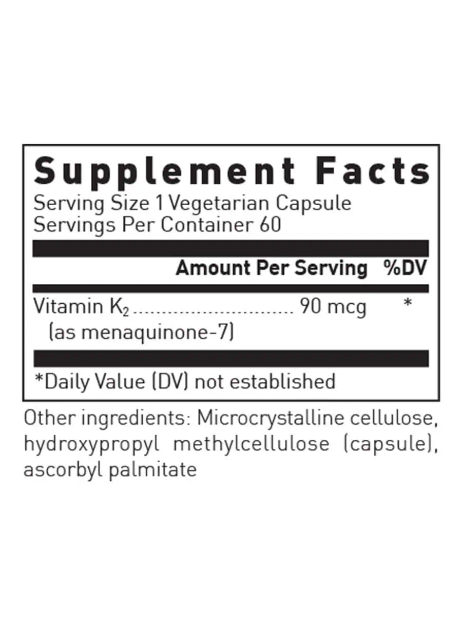 Vitamin K2 w/Menaquinone-7 (Soy-Free) — This supplement provides a significant amount of biologically active vitamin K2 in the form of soy-free menaquinone-7 (MK-7). Vitamin K2 (as MK-7) supports bone and cardiovascular health, and is more bioactive than vitamin K1 and other menaquinones. As a dietary supplement, adults take 1 capsule daily or as directed by your healthcare professional.