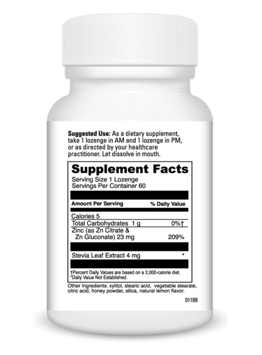 Zinc Lozenge 23mg — Tasty lemon zinc lozenges that help to support the tissues of the throat. Zinc is an essential mineral found in every body cell, crucial for a wide range of physiological functions and an important cofactor for over 200 enzymes. These lemon-flavored zinc lozenges are a great-tasting supplement for both children and adults. They contain zinc in the citrate form to support immune system function, especially important during the winter months. The lozenge form works well to support the tissues of the throat.