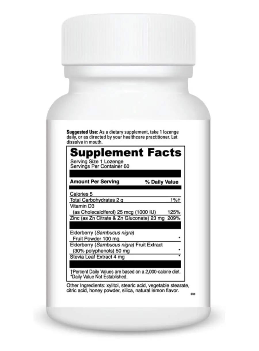 Zinc Lozenge + Elderberry Chewable — This convenient lozenge delivers immune boosters to the tissues that need it most: the throat and sinuses. Zinc lozenges are well-studied for supporting respiratory health and keeping throat tissues comfortable and healthy. As a dietary supplement, take 1 lozenge daily, or as directed by your healthcare practitioner. Let dissolve in mouth.